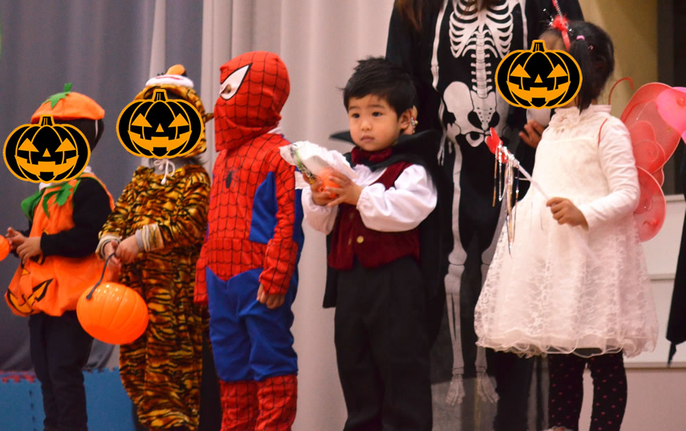 授業では、名前を呼ばれると返事をして、出席カード?を貰って壁の出席ボード?に貼りに行く、というようなことをしていて、母たち(しかも約一名かなり恐ろしい仮装をしている)の見守る異様な光景の中泣きだす子もいましたが、純正は大きな声で返事をしてカードを貰いに行けました。ただ、返事は「はい!」だったんですけどね(*´Д`)。他の子は「I'm here!」なのでね…。